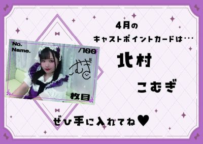 4月キャストポイントカードのお知らせ Tweet 今年から始まったキャストポイントカード☺ 4月は北村こむぎです😔🐶 100枚限定なのでぜひぜひ手に入れてください❣ 5月は兎音みさとの予定です🐰 全種類集めてみてください☺♥ Tweet